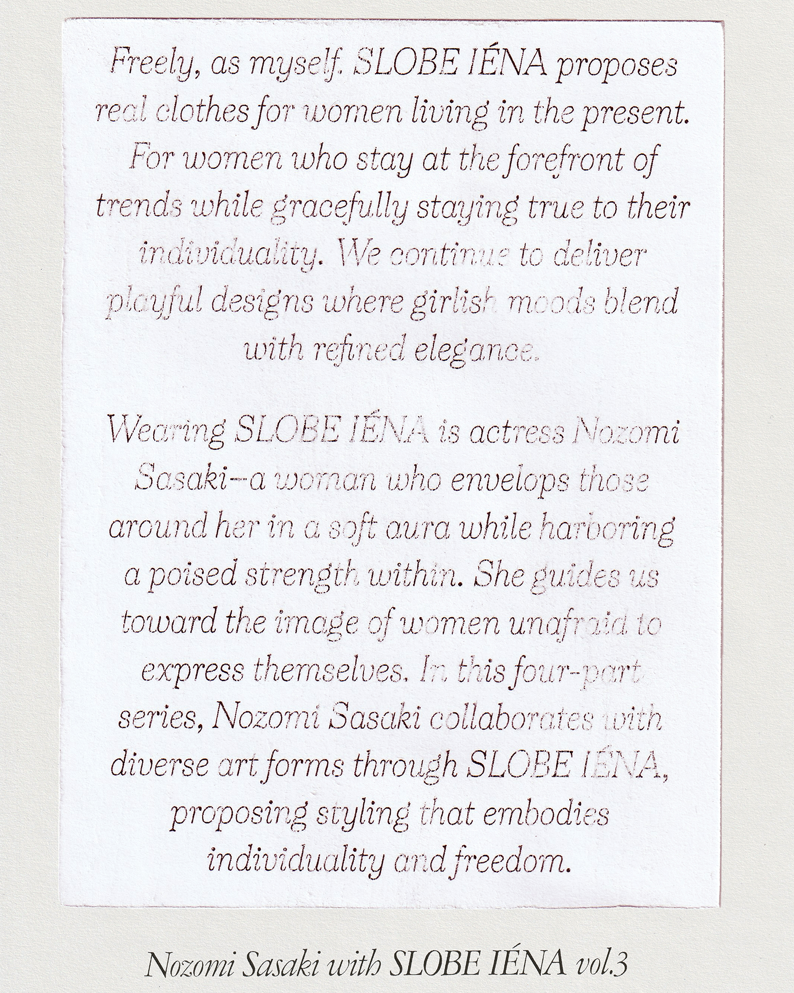 A quiet early-winter story: Nozomi Sasaki and SLOBE IENA, Vol. 3.